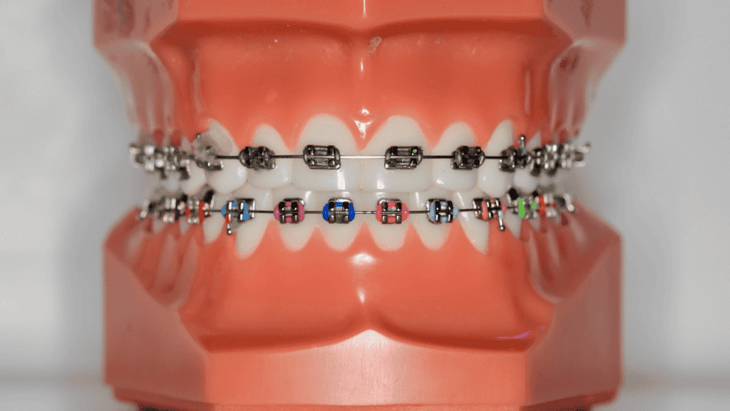 Metal brackets are attached to the surface of each tooth. A wire runs along the arch and is held against the brackets with a small elastic band, or module. Every 6-8 weeks, the braces are adjusted, and modules are changed. The modules come in a variety of colours.